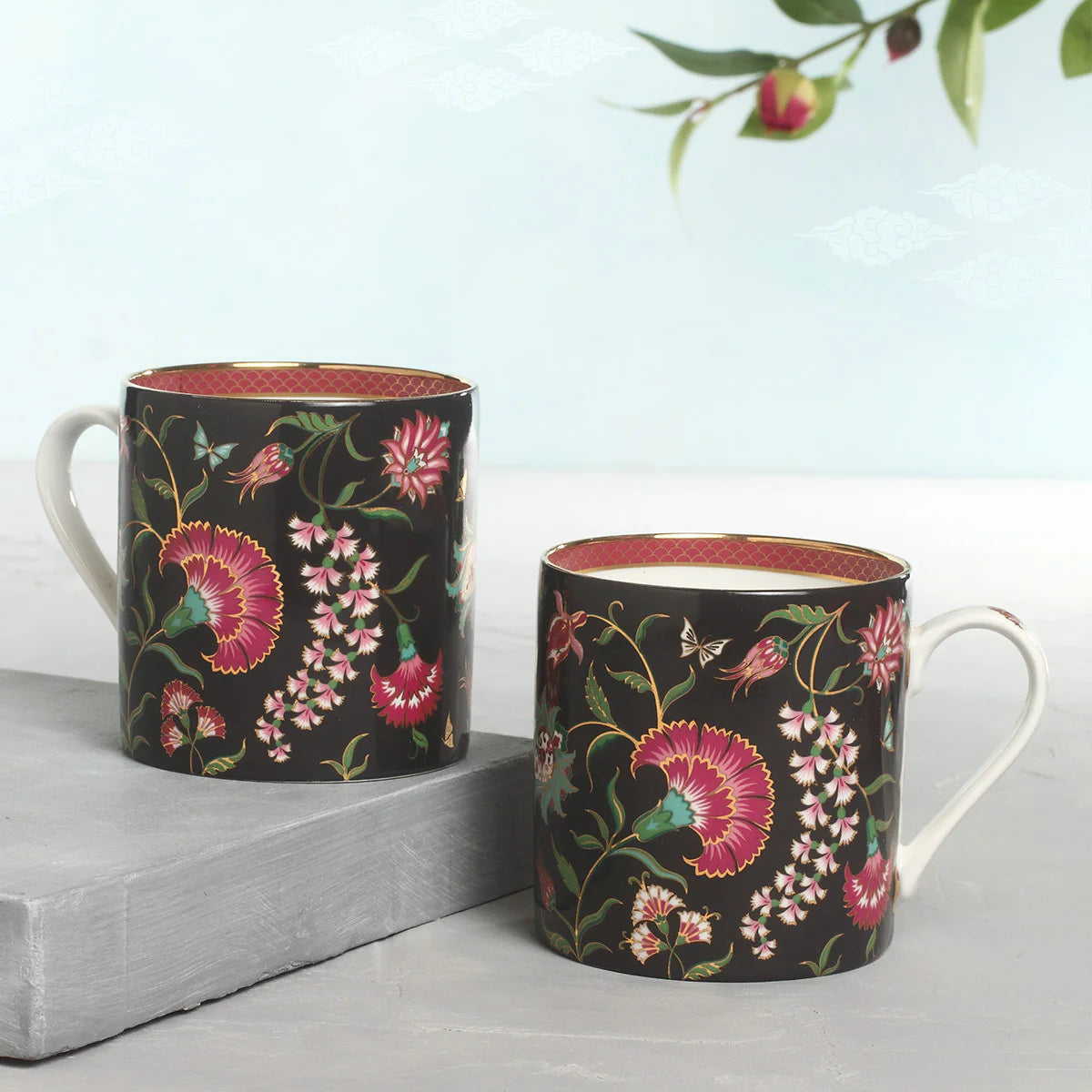 Evoke the magnificence of the silk road with this mug featuring richly coloured florals, generously detailed with gold, and contrasted against a deep charcoal base. This set of 2 mugs is packed in a beautiful red & gold Gift Box