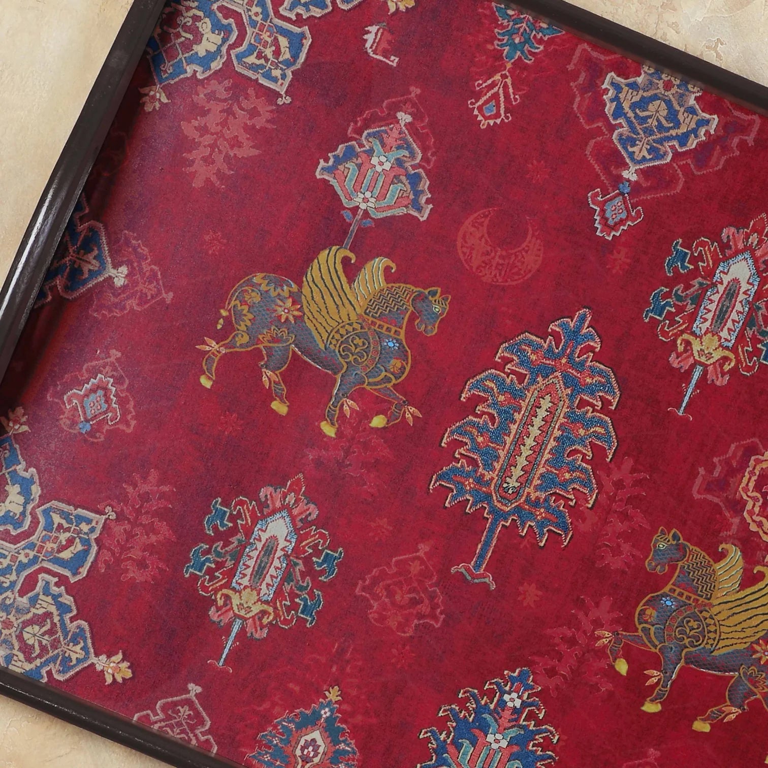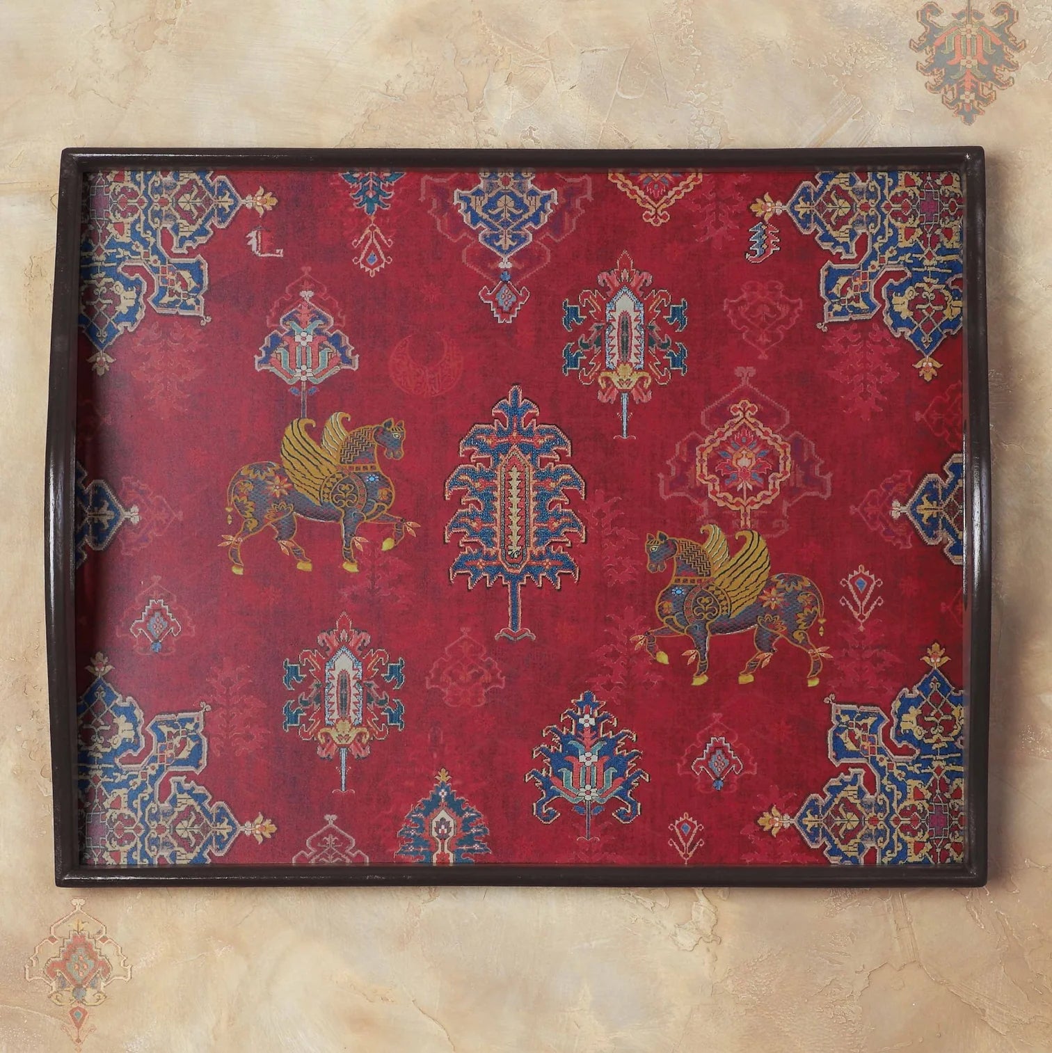 Inspired by the cultural richness of the silk road our Samarkand tray features magnificent winged horses, symbols of divine protection against a landscape of stylized cypress treesFabricated in wood, the surface of this tray is made with a matte finish, easy to clean, scratch resistant and antislip material, making it ideal for daily use.