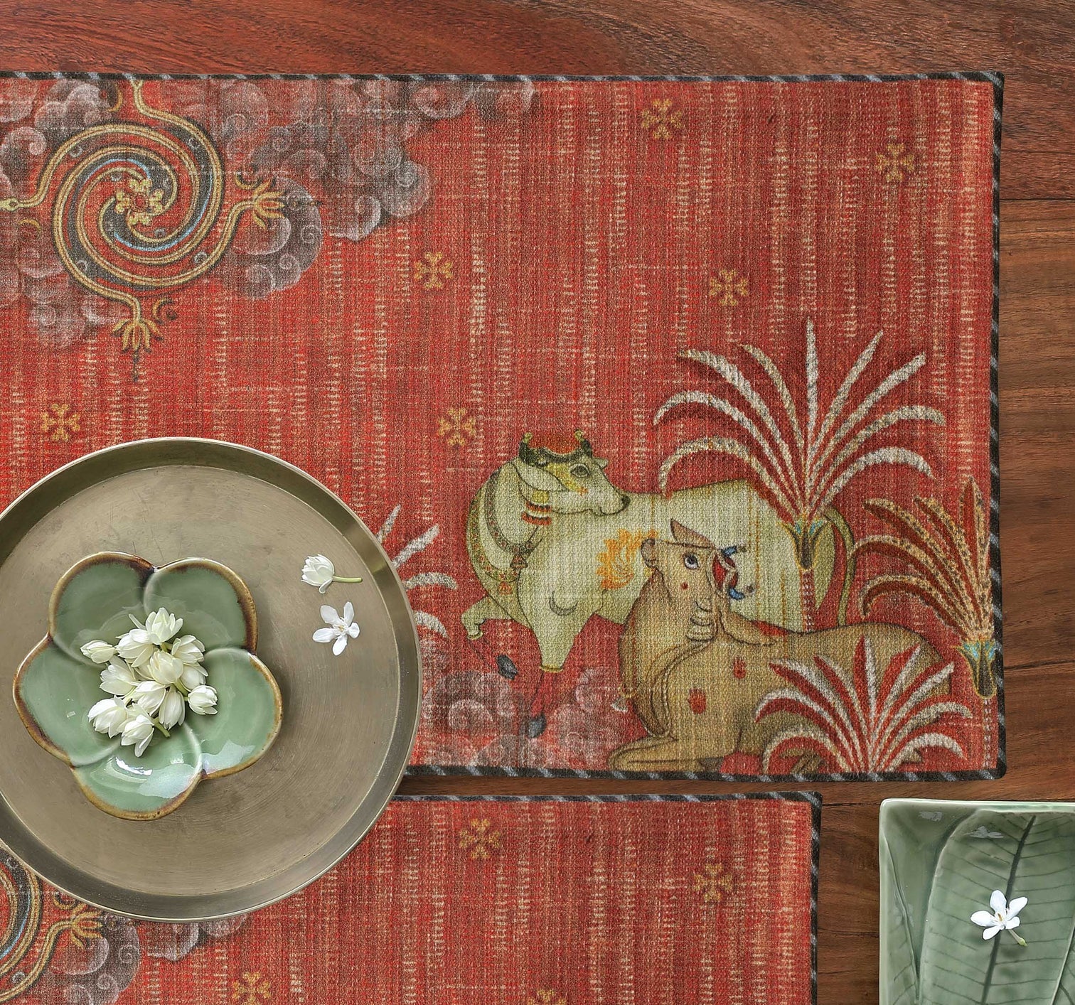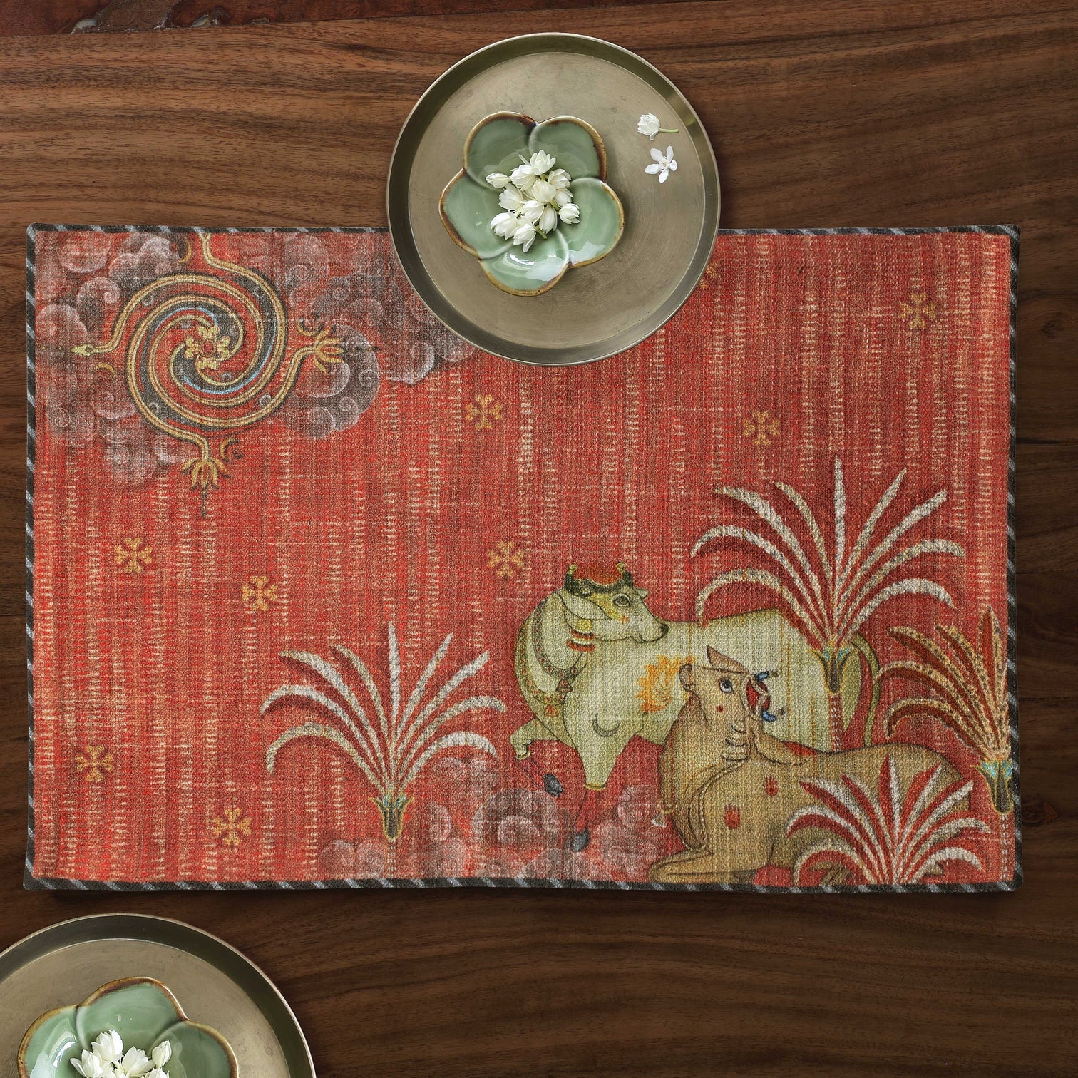 Pichwai cows dance joyfully amongst verdant palm trees. Printed on fine matte fabric with a matching deep red backing, our mats can be machine washed with ease. Perfect for transforming your every table setting or delighting your guests on special occasions, they make great gifts as well.