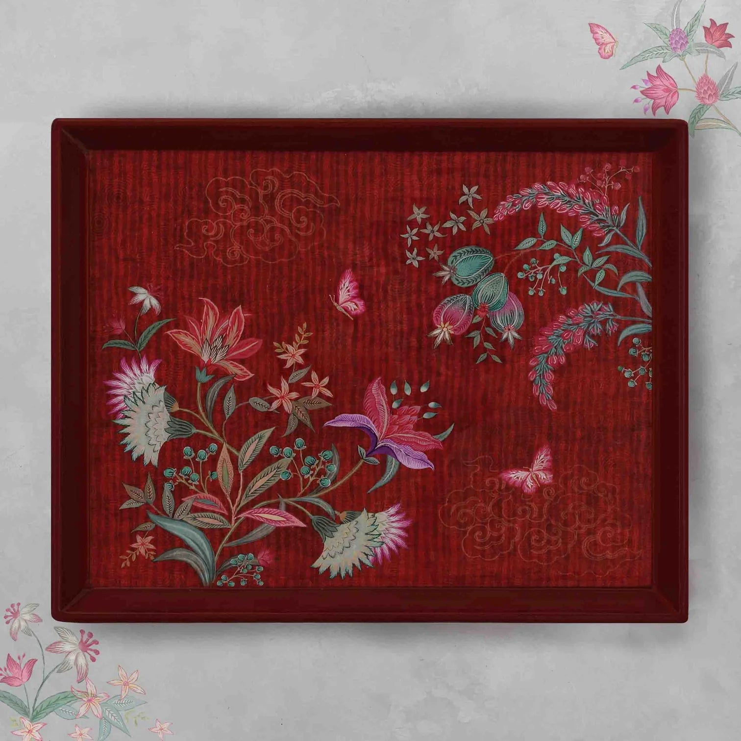 A pristine Himalayan meadow in full bloom with a delightful array of wild flowers and grasses in hues of rust, terracotta set against a contemporary striped deep red ground. Carefully hand enamelled, the underside of this tray is lined with a soft water resistant mat making it ideal to place on your bedside or powder room counter.