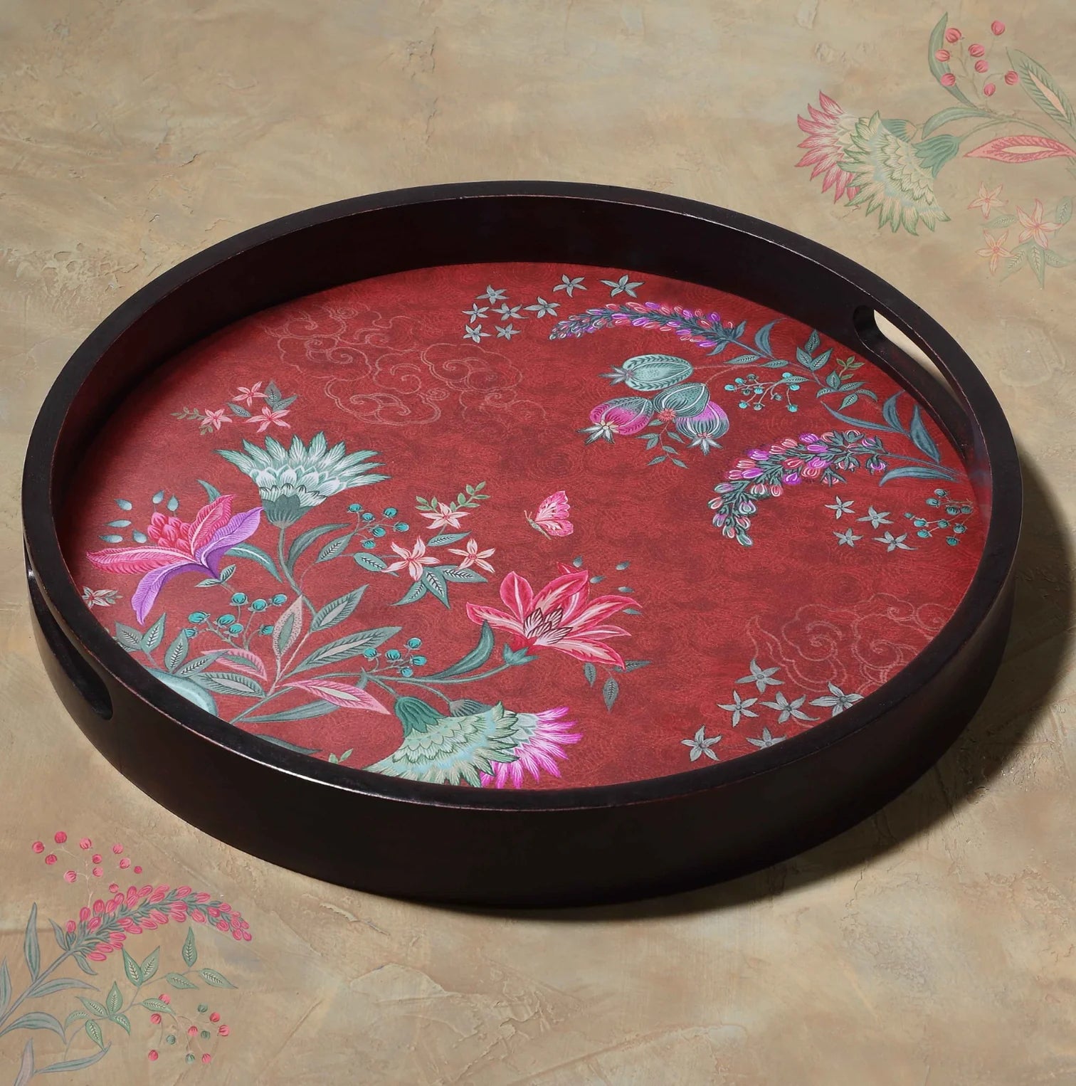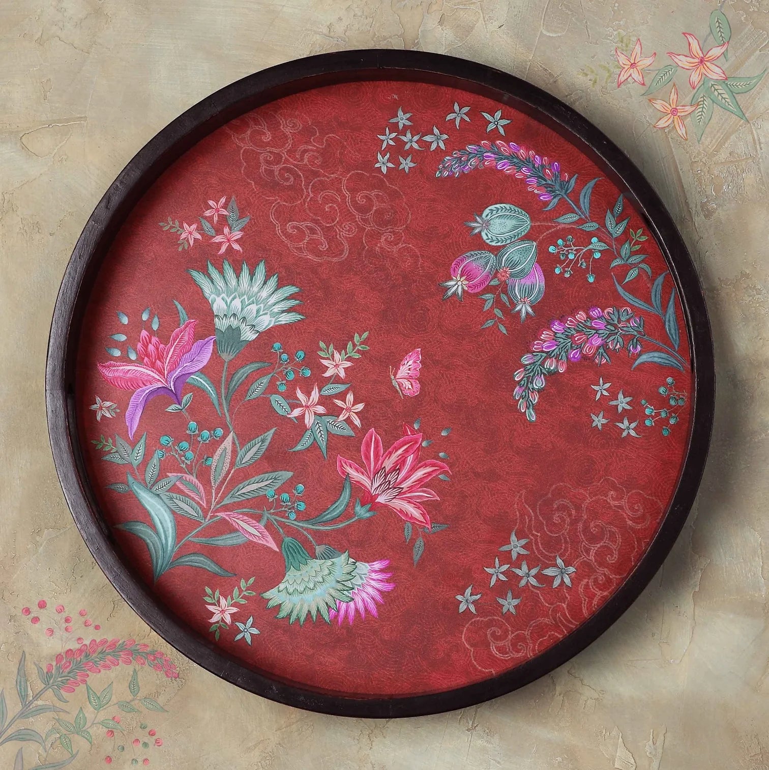 A pristine Himalayan meadow in full bloom with delightful wild flowers set against a rich deep red back ground. Hand crafted in wood in a matte finish, the surface of this elegant tray is easy to clean, scratch resistant and antislip, making it ideal for daily use.