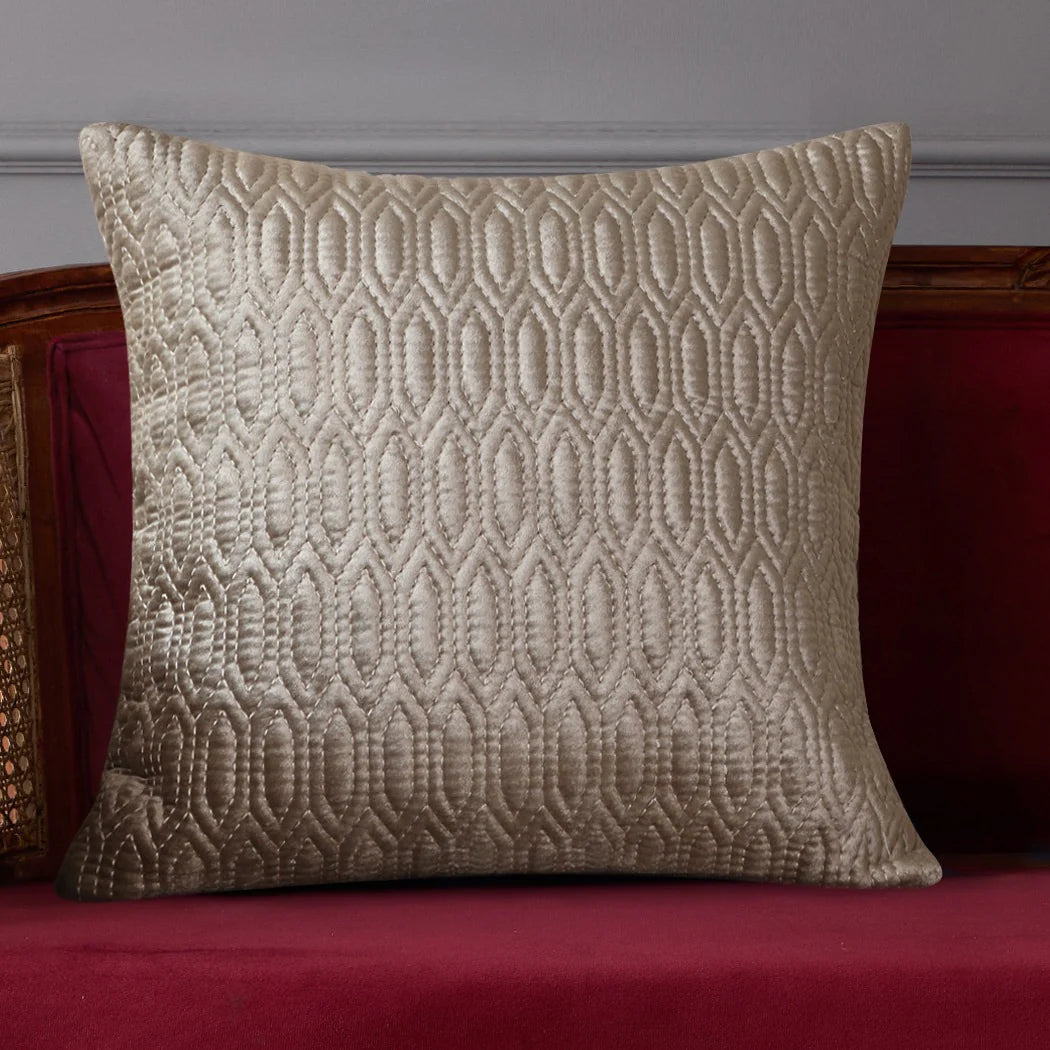 A superbly plush velvet with a fine lattice embroidered on it, makes this elegant silver grey hued cushion a versatile and rich accompaniment to our printed designs.