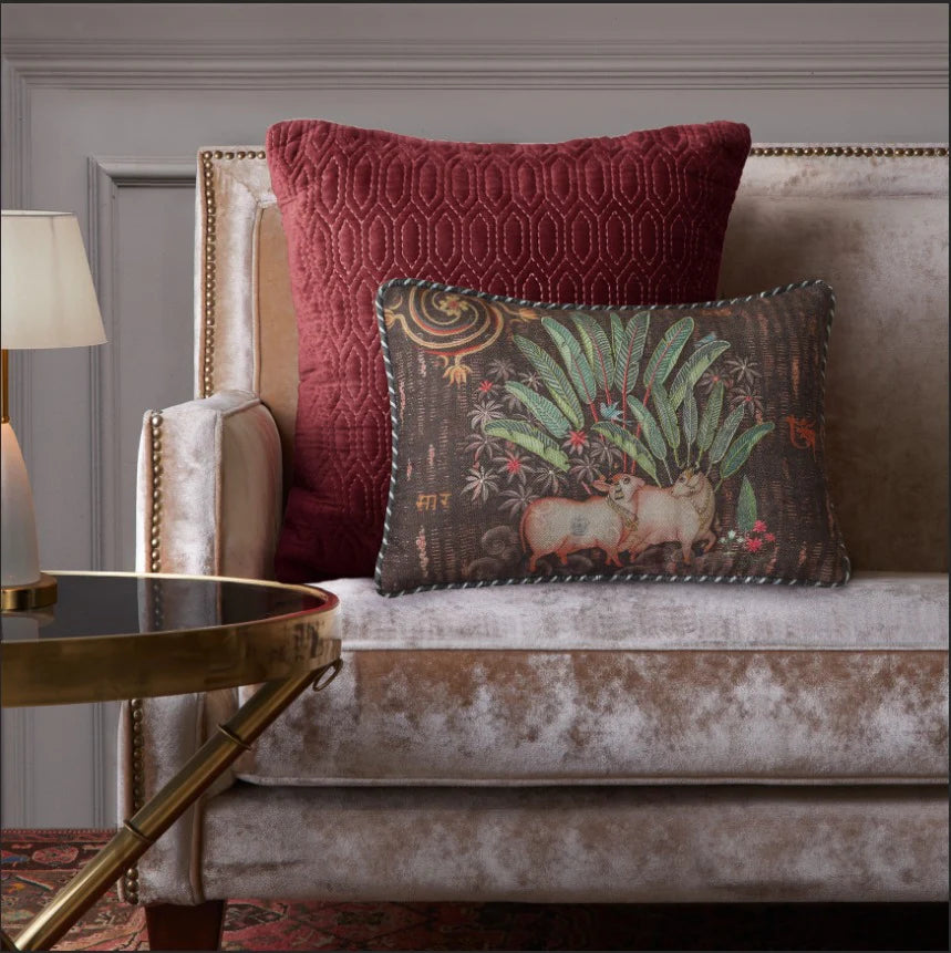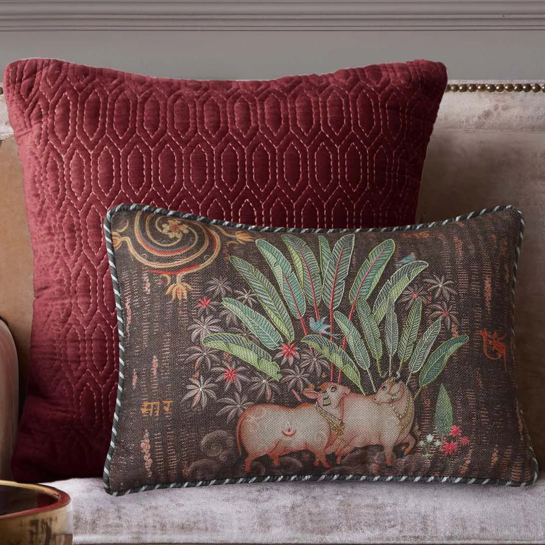 Pichwai cows against a backdrop of lush palm trees. Printed on a rich textured fabric and enhanced with fine hand embroidery, they lend a contemporary Indian touch to your space. Each cushion is finished with smart stripe backing and a charcoal satin backing.