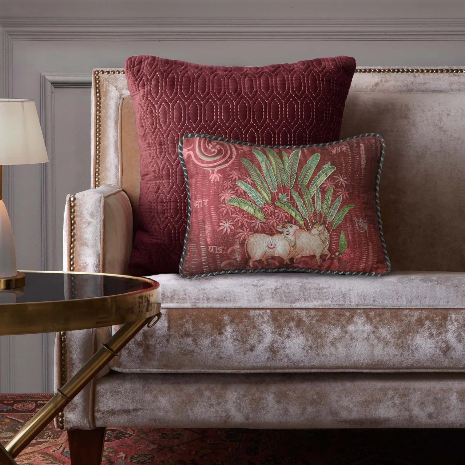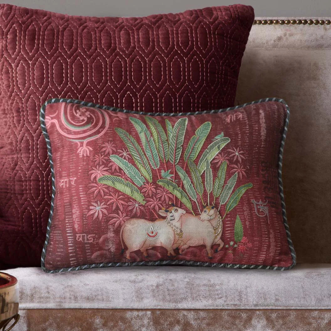 Pichwai cows against a serene backdrop of lush palm trees. Printed on a rich textured fabric and enhanced with fine hand embroidery, they lend a contemporary Indian touch to your space. Each cushion is finished with smart stripe backing and a soft maroon satin backing.