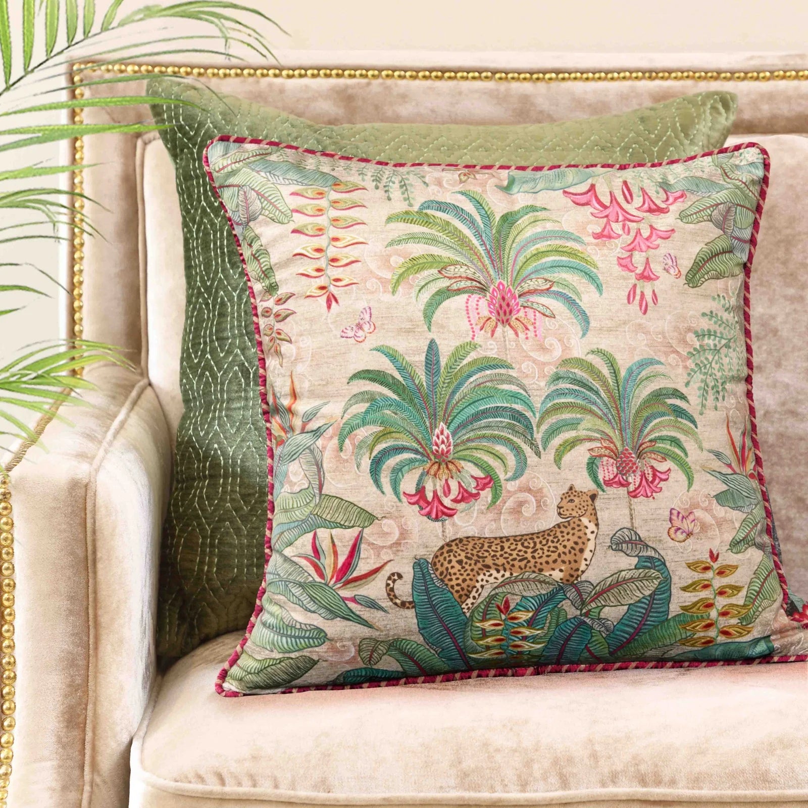A lush grove of palm trees with wistful leopards evokes the richness of India's coastal forests. Printed on fine matte velvet that's well suited for both warm and cool weather, our cushions are finished with a striped piping and soft green satin backing.