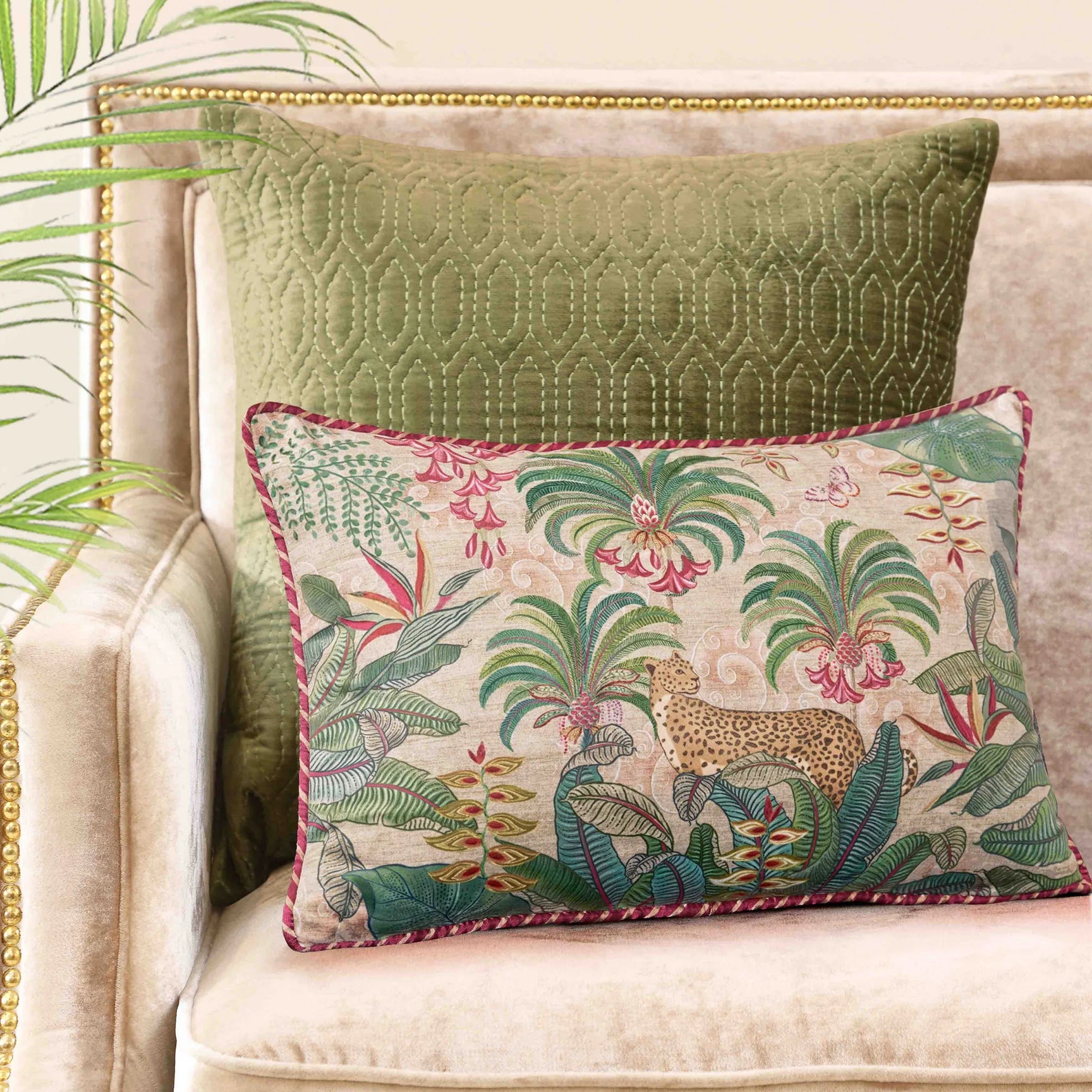 A lush grove of palm trees with wistful leopards evokes the richness of India's coastal forests. Printed on fine matte velvet that's well suited for both warm and cool weather, our cushions are finished with a striped piping and soft green satin backing.
