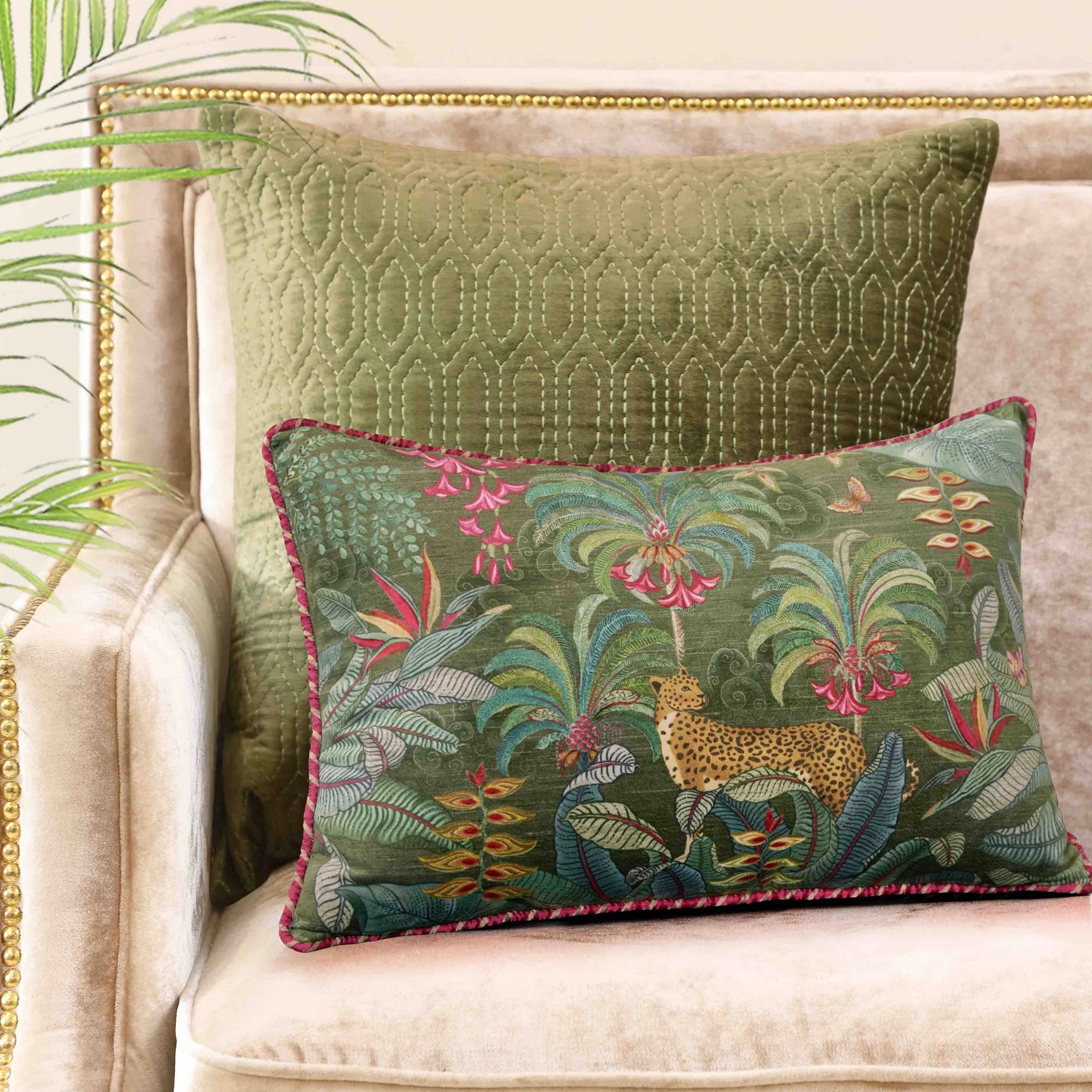 A lush grove of palm trees with wistful leopards evokes the richness of India's coastal forests. Printed on fine matte velvet that's well suited for both warm and cool weather, our cushions are finished with a striped piping and soft green satin backing.