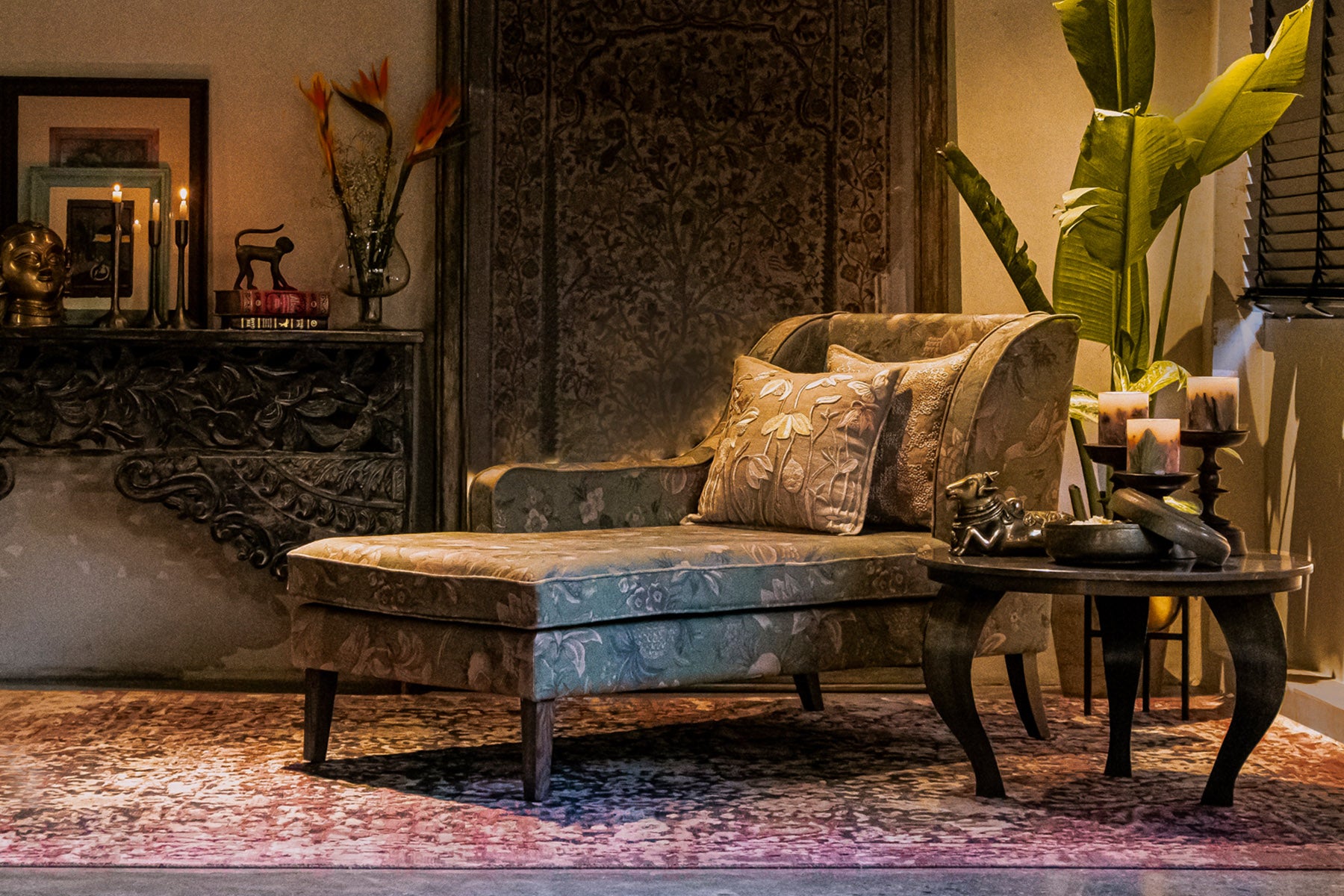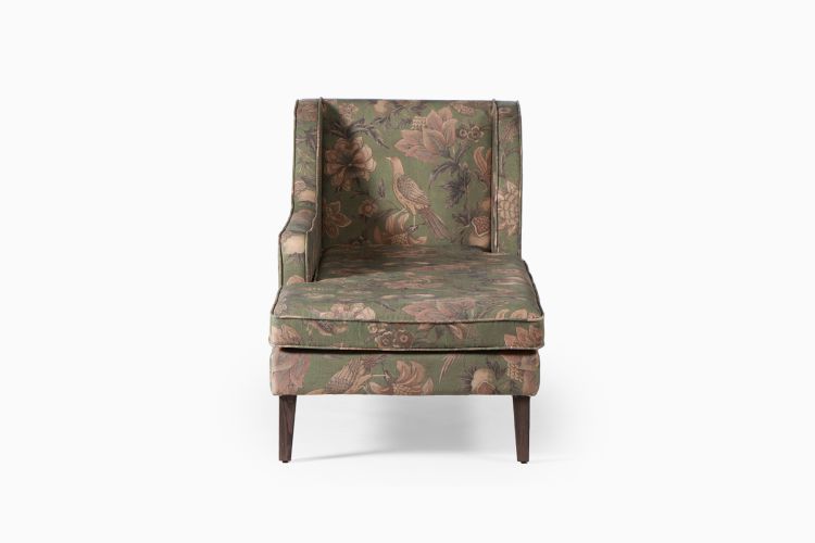 A marriage of clean design and plush details, Vilasita boasts a whimsical printed upholstery curated from the Sabyasachi furnishings collection and a solid wood base with tapered legs that evoke mid-century romanticism. Add a sculptural touch to your bedroom with this intriguing chaise or mirror a pair in your living room for serene symmetry.
