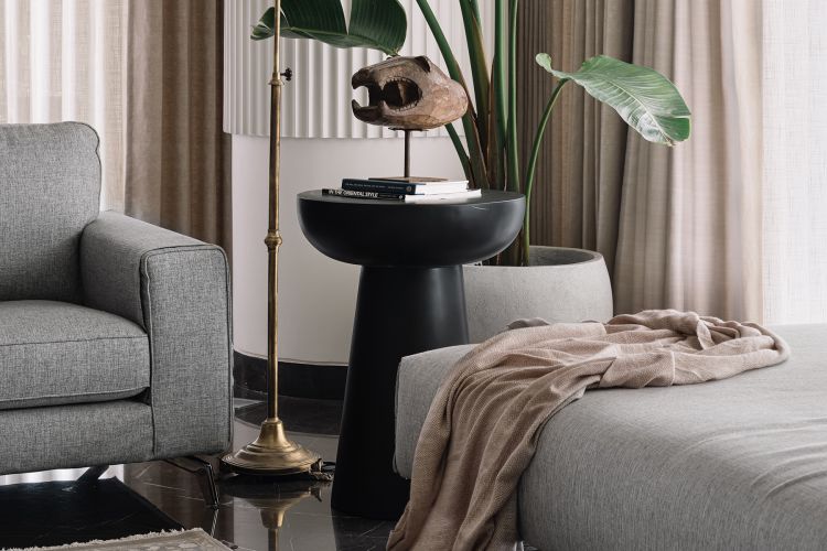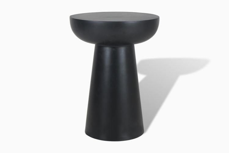 Tucked next to an armchair, the Nero side table supports a warm mug of tea or a bubbling flute of Champagne with a bold, luxe look. A slender column rises from the floor, curving in only to flare out into a round table top perfectly sized for a drink, a treat and a book.