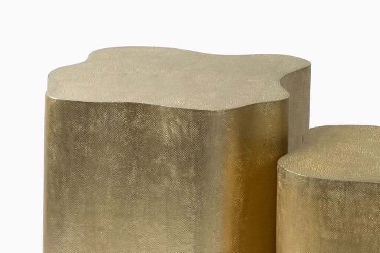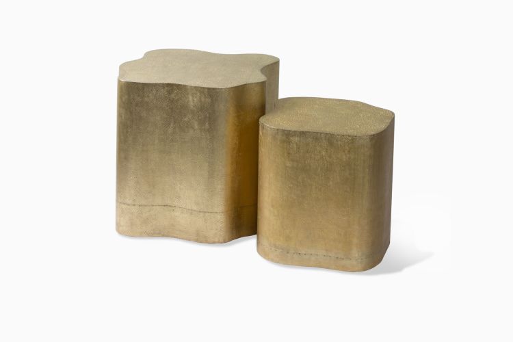 A true luxury piece with a minimalist form - Dale is inspired by the stump of the tree of knowledge. Crafted from an MDF interior and a hammered brass coat exterior, the table features a delicately engraved top exposing the heart of a golden tree to the very heart of a home. Available individually or as a set of two side tables.
