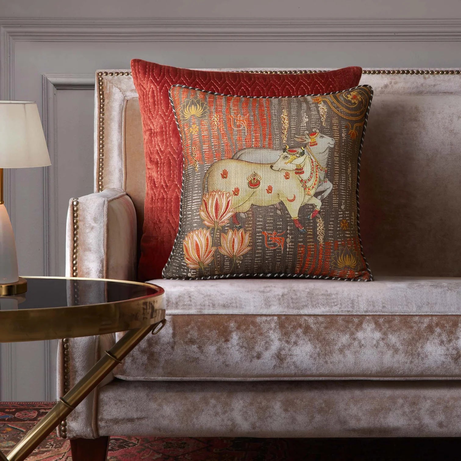 Pichwai cows dance joyously amongst blossoming lotuses. Printed on a rich textured fabric and enhanced with fine hand embroidery, they lend a contemporary Indian touch to your space. Each cushion is finished with smart stripe backing and a soft maroon satin backing.