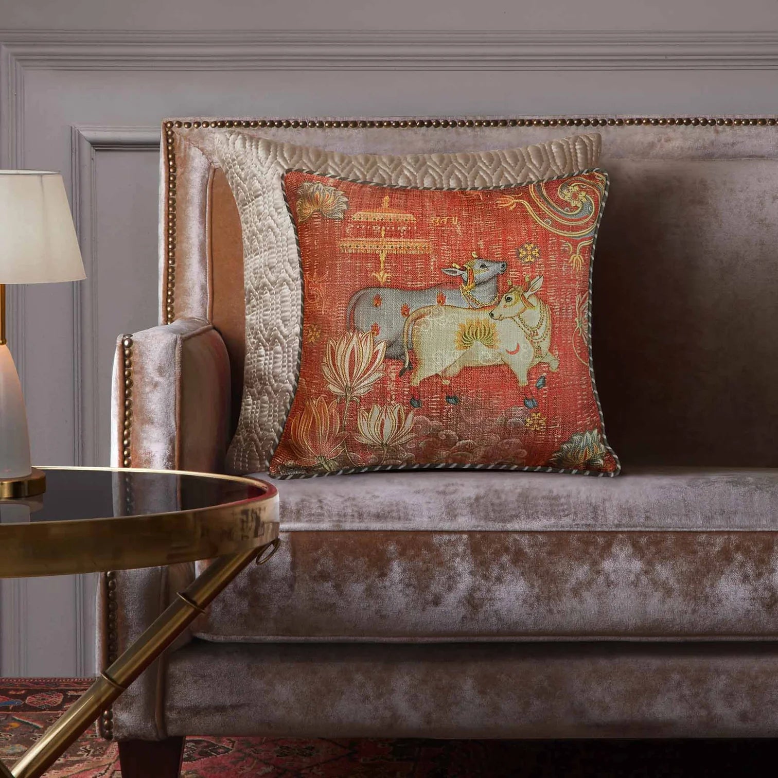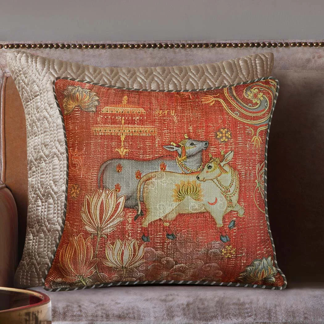 Pichwai cows  dance joyously amongst blossoming lotuses. Printed on a rich textured fabric and enhanced with fine hand embroidery, they lend a contemporary Indian touch to your space. Each cushion is finished with smart stripe backing and a soft maroon satin backing.