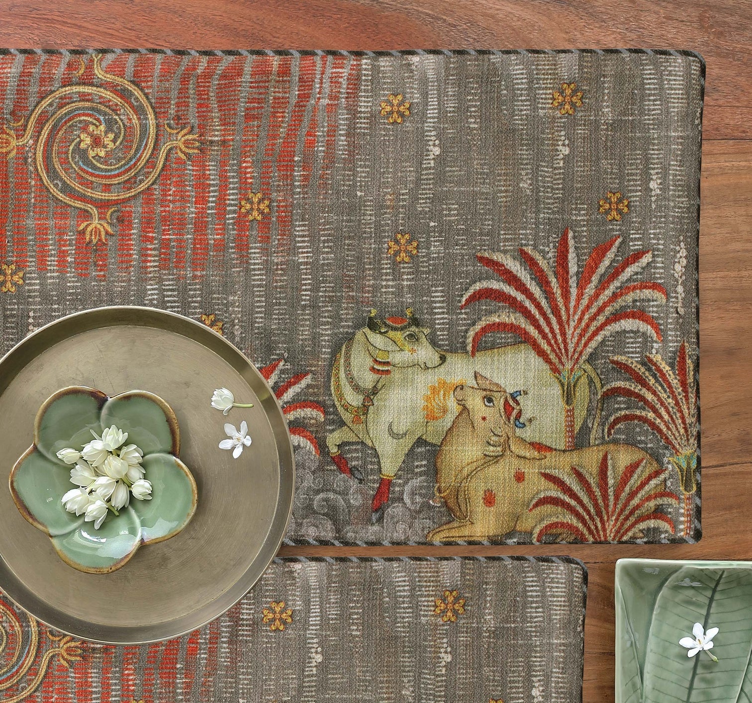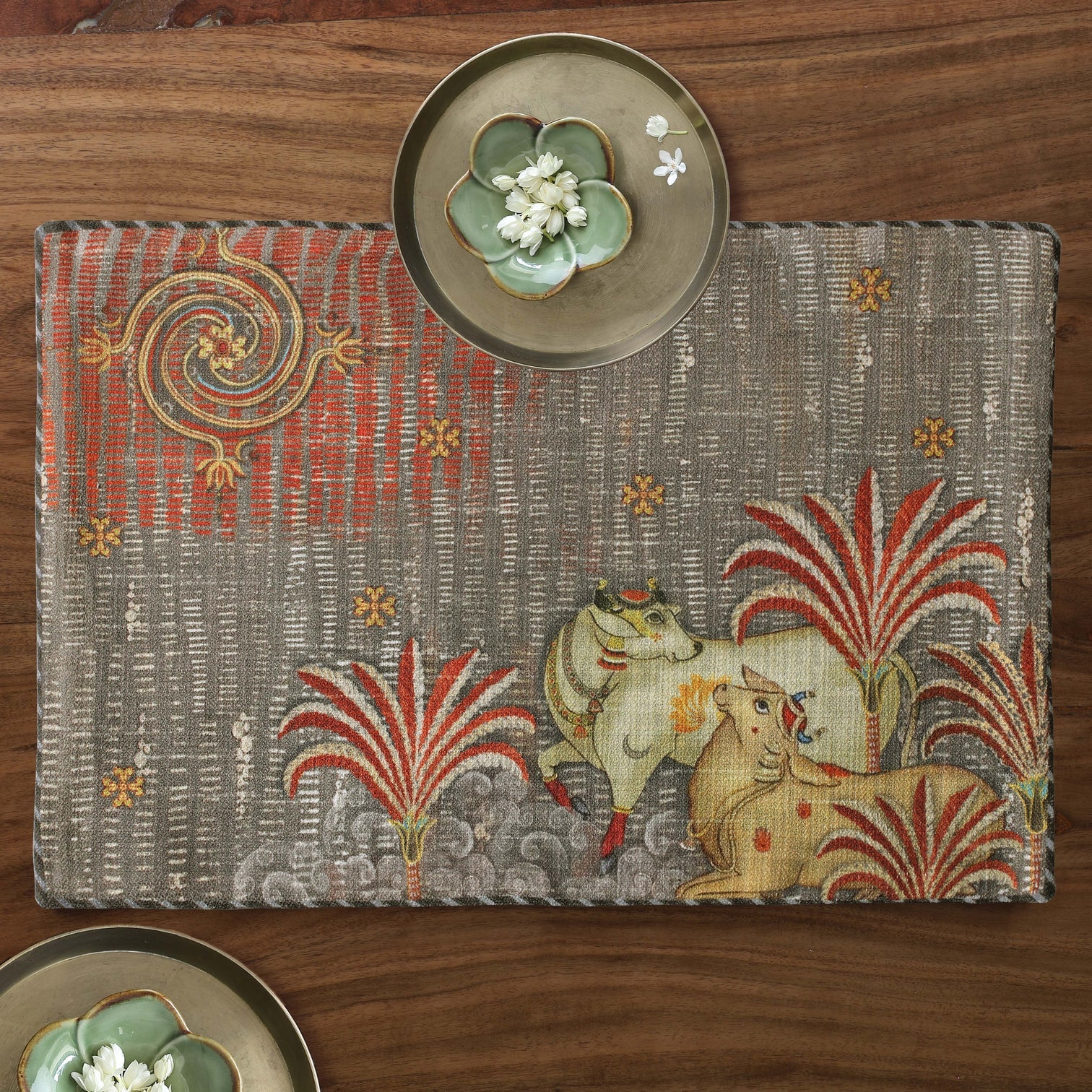 Pichwai cows dance joyfully amongst verdant palm trees. Printed on fine matte fabric with a matching charcoal backing, our mats can be machine washed with ease. Perfect for transforming your every table setting or delighting your guests on special occasions, they make great gifts as well. Height 33 cm x Width 48 ( 13 x 19" )
