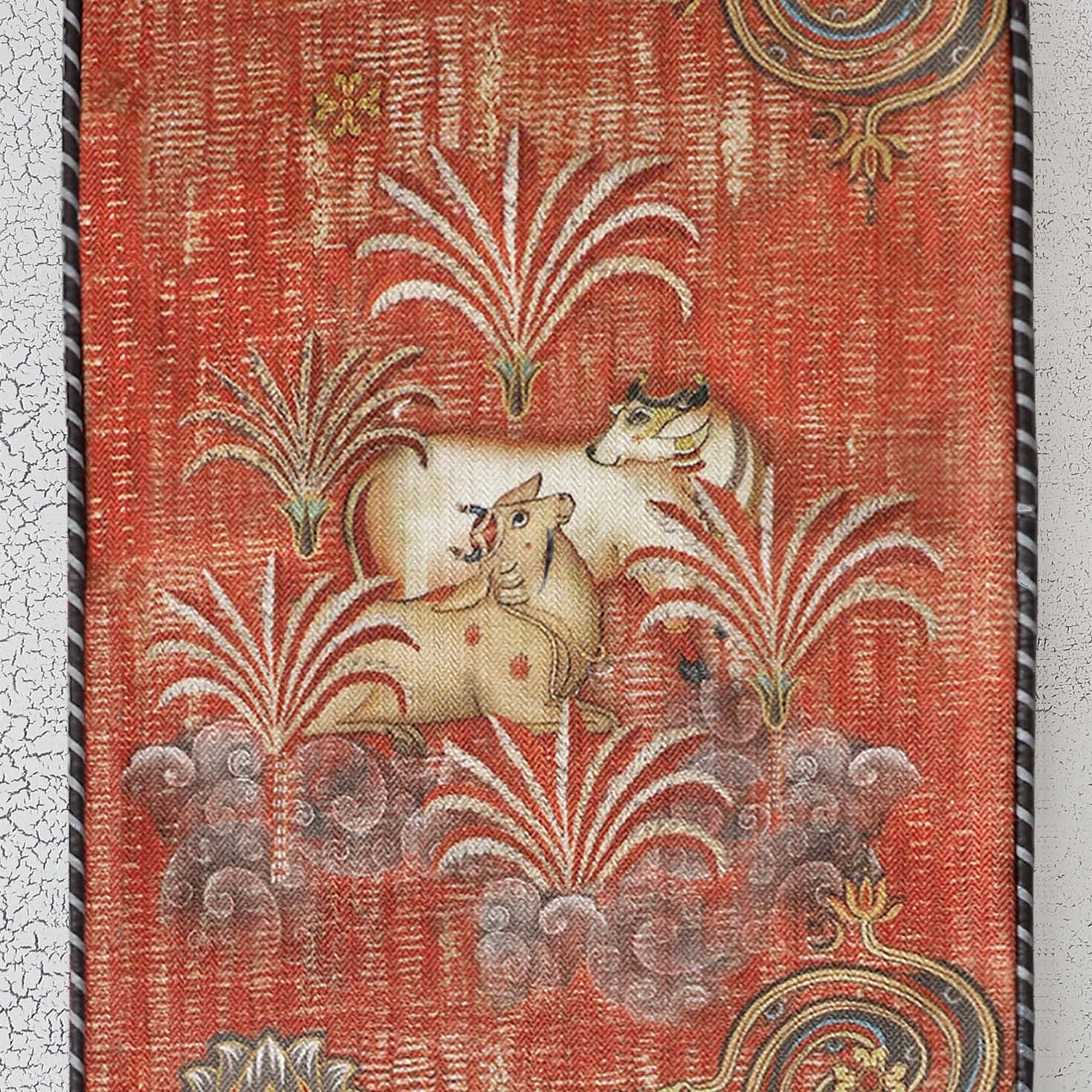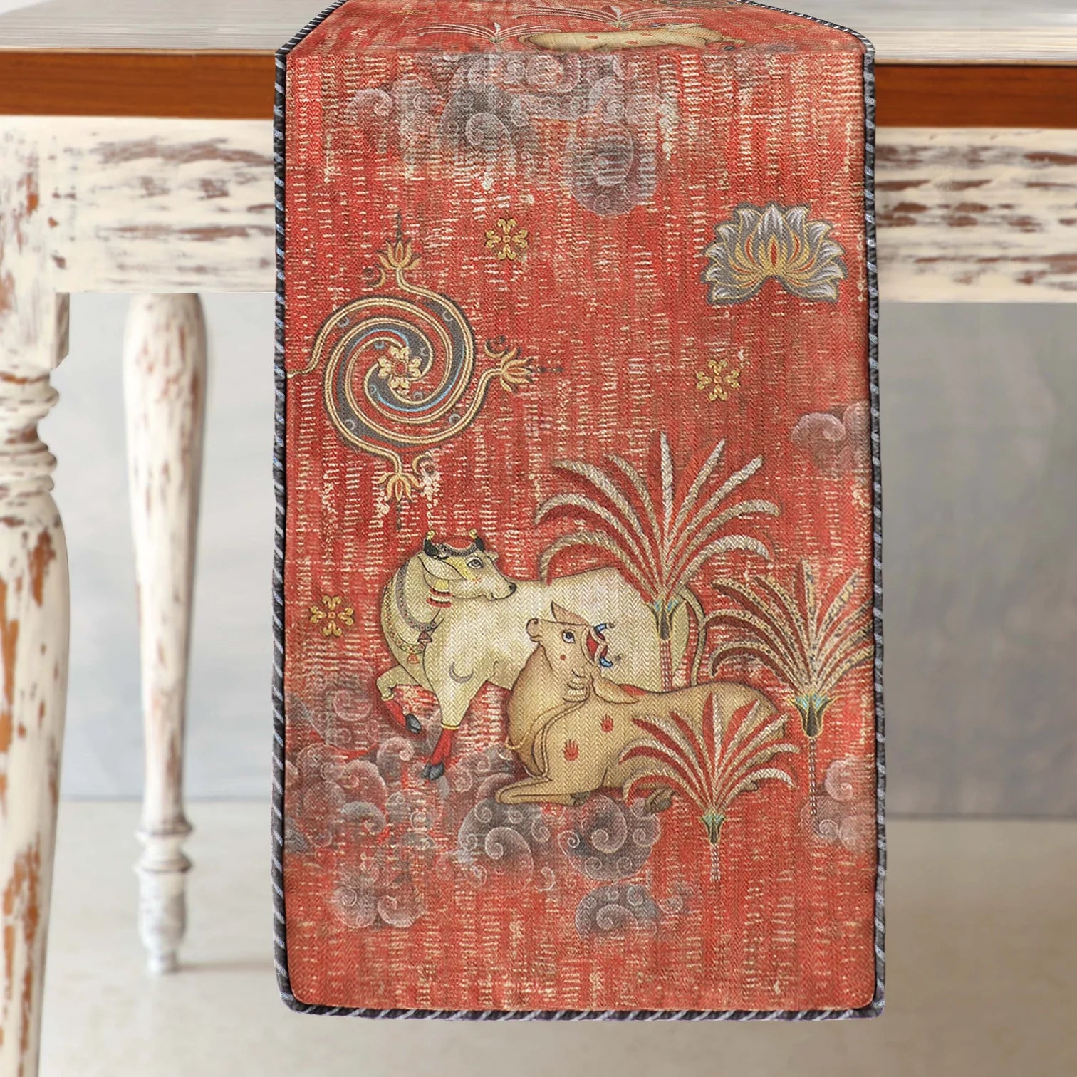 Pichwai cows dance joyfully amongst verdant palm trees. Printed on fine textured fabric and finished with a stripe piping, our runners can be home washed and make great gifts as well.