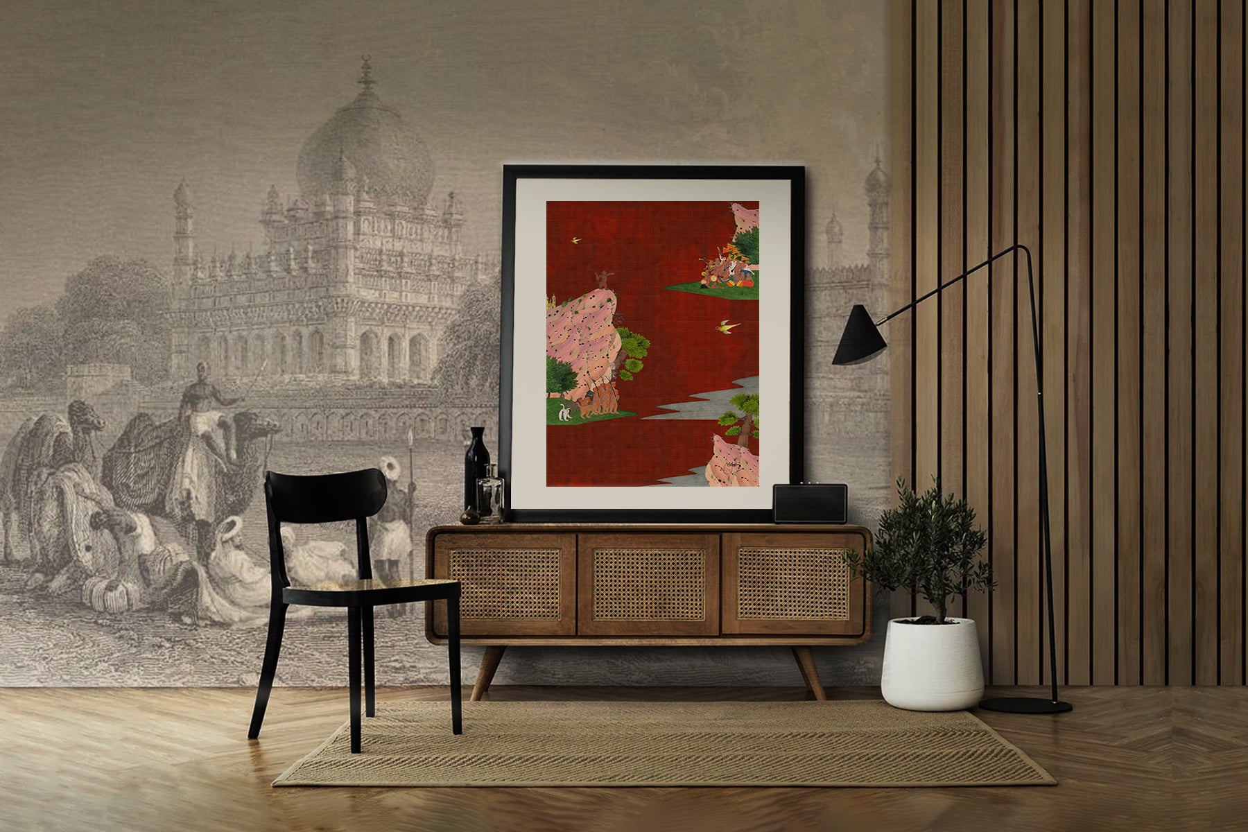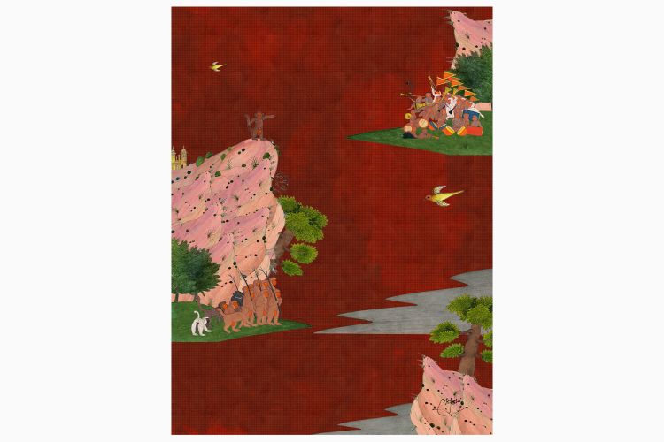 The series "Behind the Mountains" unfolds the magnificence of the Mewar culture - celebrating the natural landscape and inconogrphy in vibrant colour and vivid details. Rendering tales of the Mewar kingdom, this artwork is inspired by the evenings spent amid the Aravali Hills and the splendid beauty that encapsulates the scene.